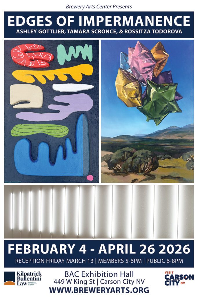 Experience the spirit of the West through the eyes of 32 artists at the Brewery Arts Center’s group exhibition, Western Feel. Featuring talented works from Carson City, Carson Valley, Virginia City, Reno, and beyond, This showcase captures the essence of Western life, landscapes, and culture. From sweeping desert vistas to rugged mountain scenes and vibrant depictions of local heritage, each piece reflects the unique charm and beauty of our region. Don’t miss this celebration of creativity and community, uniting the best of northern Nevada’s artistic talent under one roof.