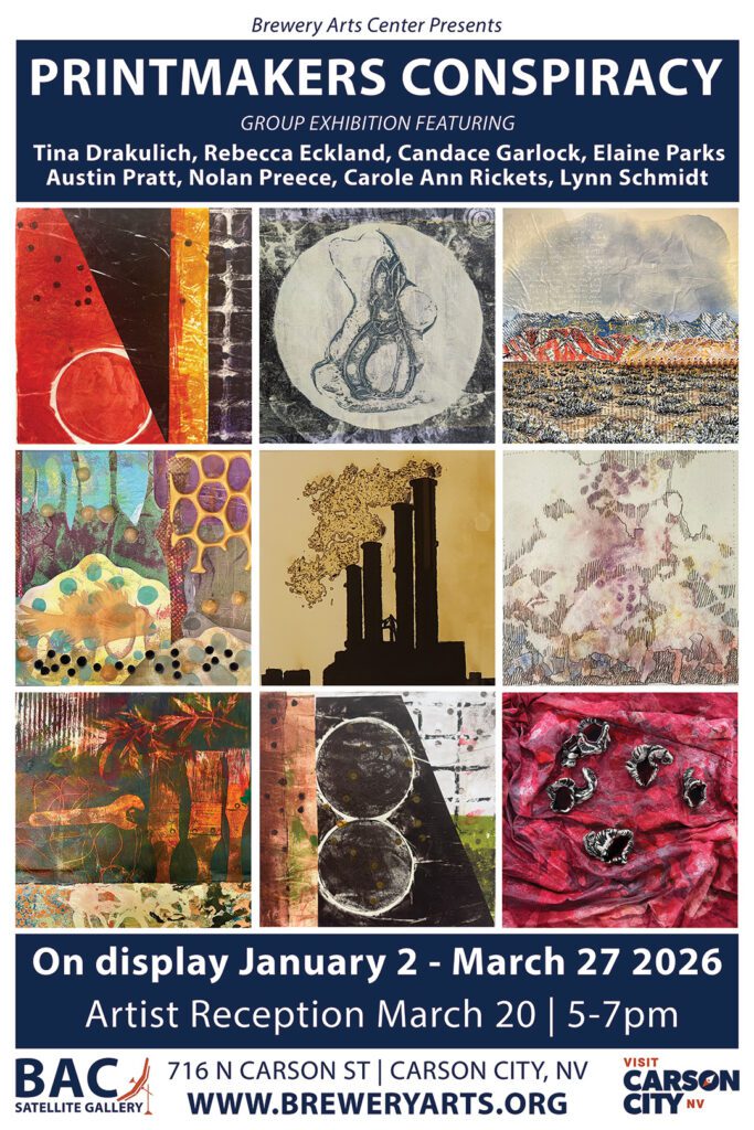 Printmakers’ Conspiracy: This exhibition brings together a dynamic group of artists dedicated to strengthening the printmaking community in Nevada and the surrounding region. Through collaboration, conversation, and shared experimentation, the collective fosters connections among artists of all experience levels. For this exhibition, members explored monotype printmaking using a gelatin matrix, a process that balances spontaneity and control while producing richly textured, one-of-a-kind works, with many artists incorporating additional media to expand the creative possibilities. Featuring work by Tina Drakulich, Rebecca Eckland, Candace Garlock, Elaine Parks, Austin Pratt, Nolan Preece, Carol-Ann Ricketts, and Lynn Schmidt, the exhibition highlights both individual voices and a shared spirit of innovation, demonstrating how printmaking can build community, inspire experimentation, and celebrate the vitality of the medium.